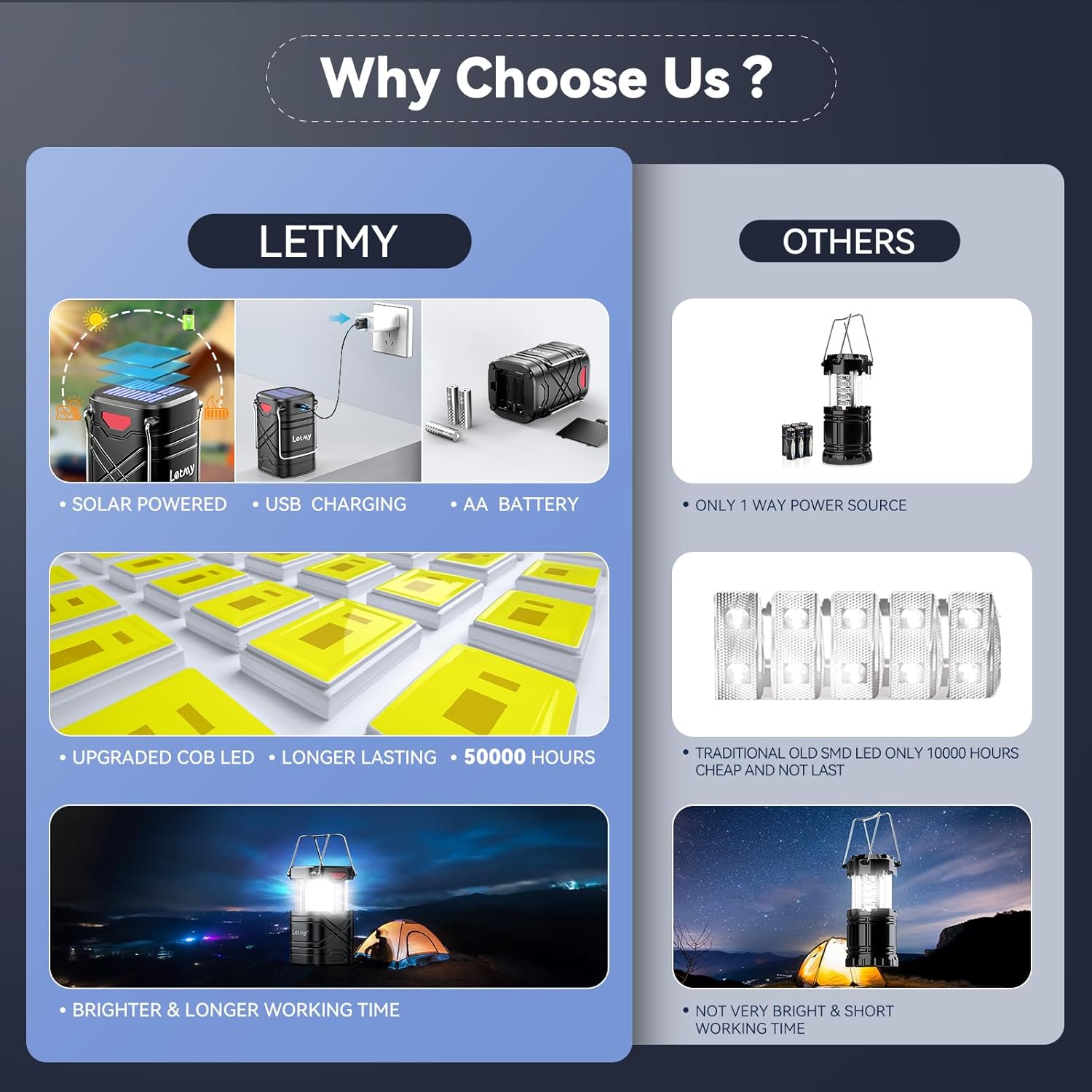 Introducing the LETMY 4 Pack Camping Lantern – your ultimate companion for all your outdoor adventures and emergency preparedness needs. With its versatile design and multiple power sources, this rechargeable LED lantern is a must-have for any situation.